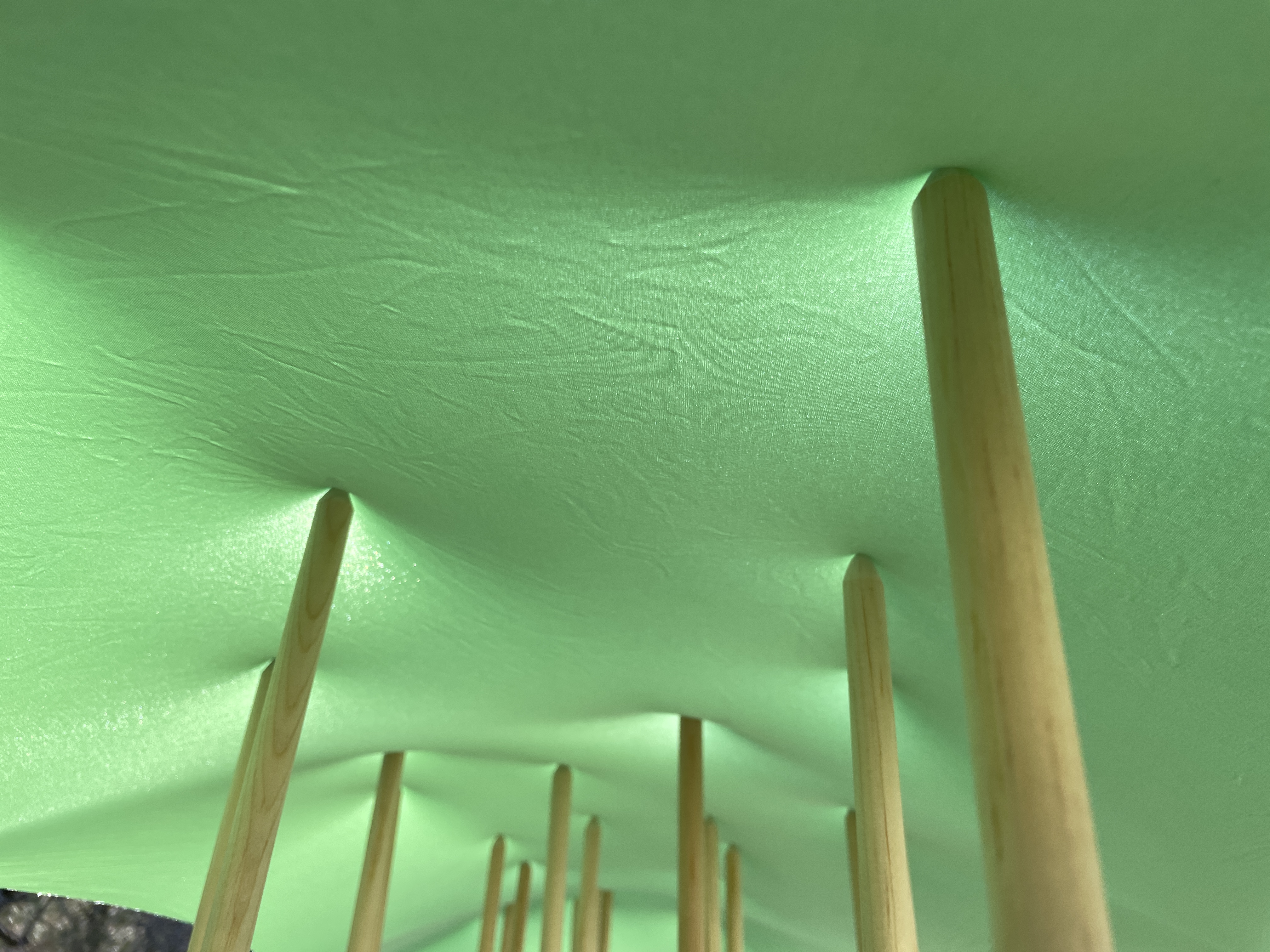 A structure derived from my intensive research into the horned melon. I stretched fabric over sharpened wood dowels laid out according to a melon whose horns were dipped in ink and subsequently rolled. Extensive material tests led me to choose this fabric because of its qualities when stretched. It allows light to pass through much more at the points of the dowels. I envisioned this as a much larger structure that could live as a large-scale exhibit and provide the feeling of what it might be like inside the melon. The images towards the bottom are maps I created based on three melons and prints I made at the beginning of the project. Maps were made using Rhino 7 and the plugin Grasshopper, and the Artifact was built using standard hand and power tools.